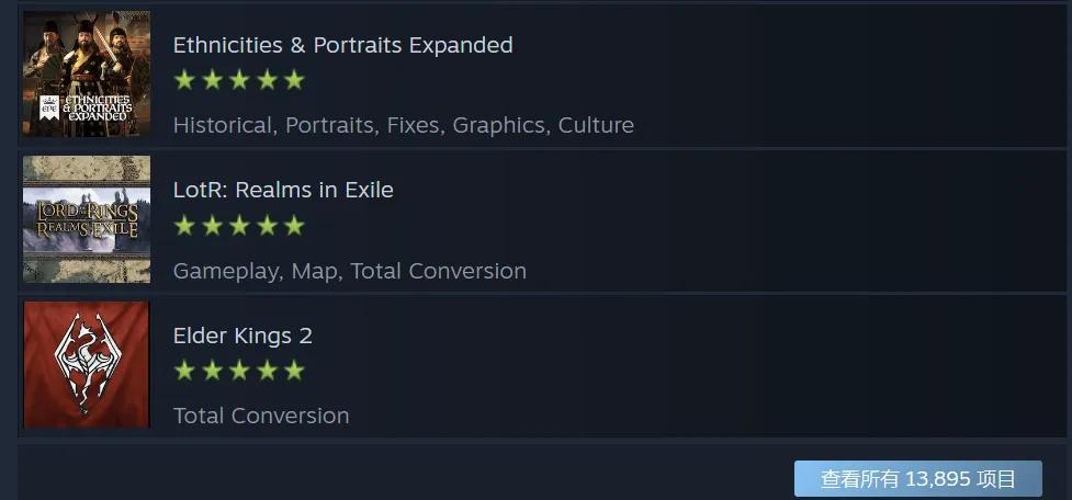 CK3的MOD社區一向非常熱鬧。創意工坊內,大大小小的玩家自制模組超過了一萬多個,最熱門的模組訂閱超過五十萬人。玩家自制模組持續擴展着遊戲內容,也成爲了這款歷史策略遊戲始終能保持長線生命力的動力之一。