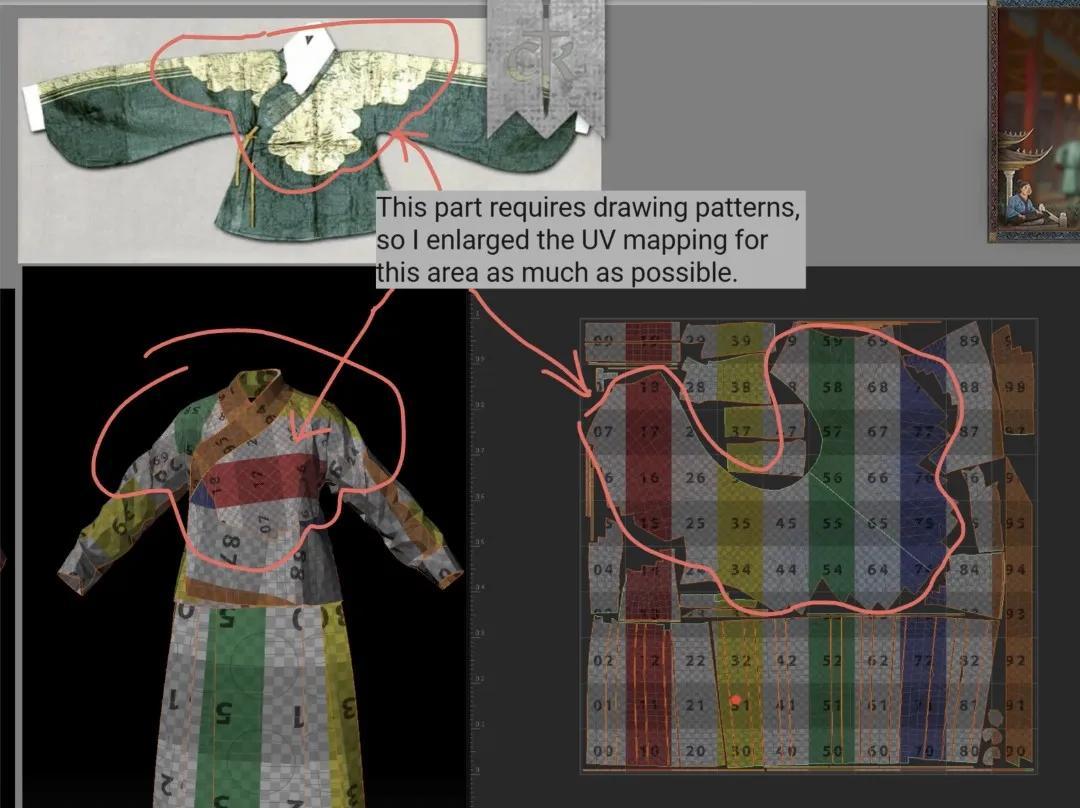 爲了解決這個問題,TAMA在進行UV排布時專門將雲肩部分拆分出來,並重新手繪紋樣,在儘可能放大細節的同時,也要保證其他部分的清晰度。