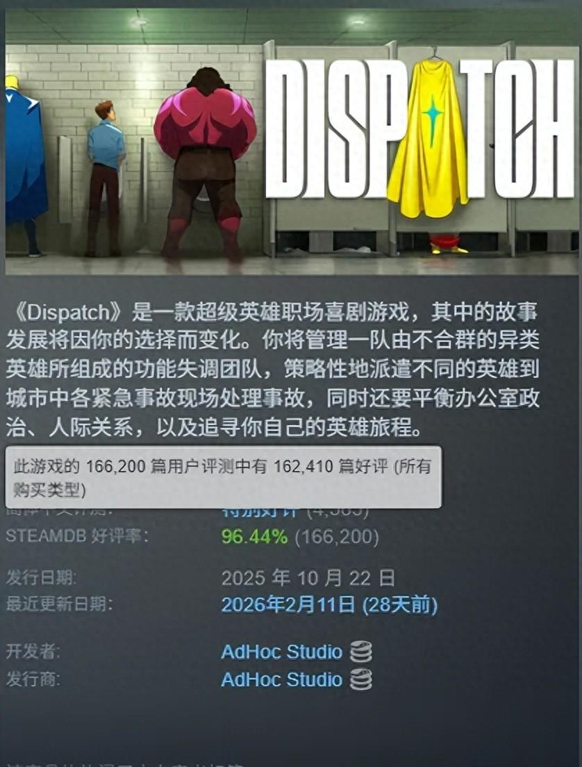 在今天這個時間點,恐怕沒有一款遊戲比《超英派遣中心》更有資格起這個標題。截止2026年初,這款號稱“超級英雄職場喜劇”的遊戲,已經售出了超過300萬份,且在Steam上有着高達96%的總體好評率。