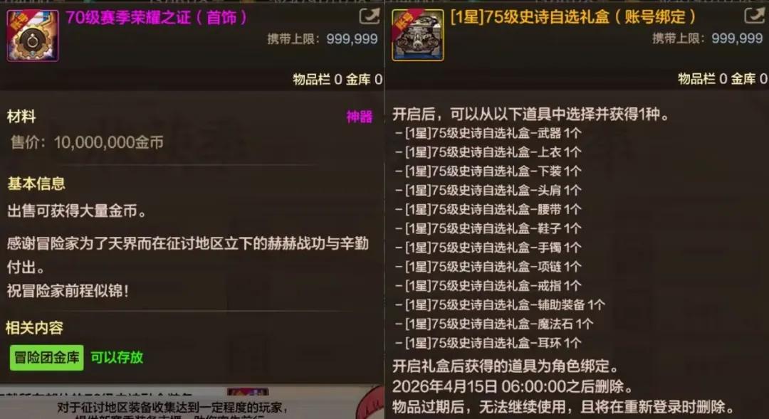 整個活動可以拿到4個榮譽之證和1個80級自選史詩禮盒!(雖然說是80級自選史詩,但實際裏面的裝備是75級的)