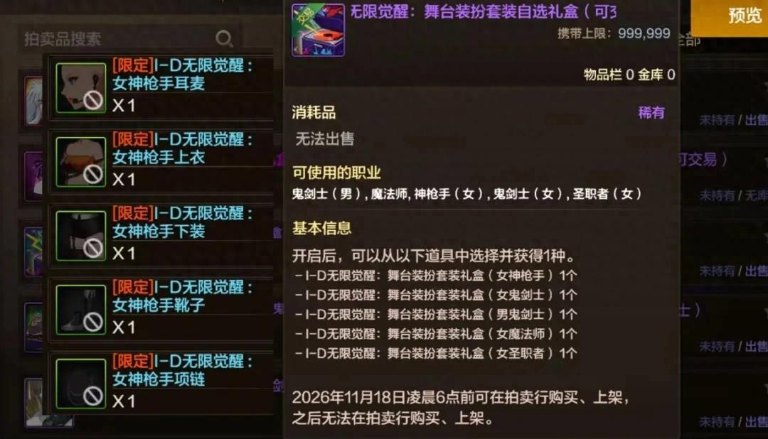 首先是“女團時裝禮盒”,打開後可以從男鬼劍、女鬼劍、女槍手、女魔法、女聖職這5個職業時裝中任選其一。