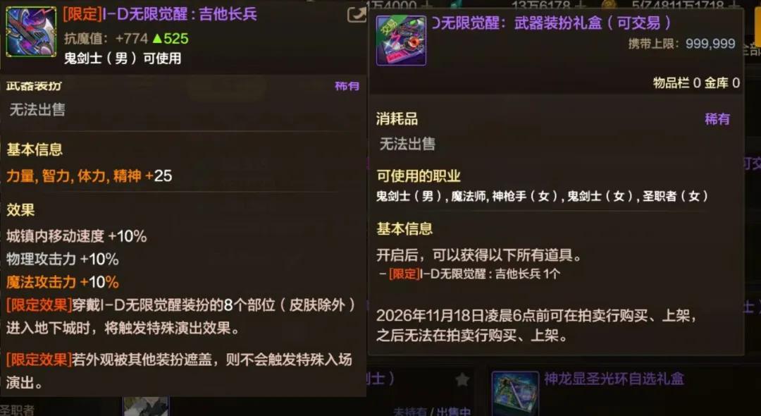 屬性和最新的春節武器裝扮一樣,均爲25點四維、10%移速、10%雙攻、以及774點抗魔值!