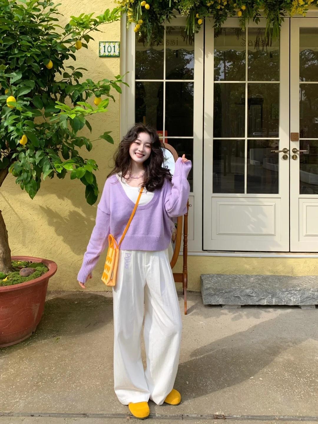 闊腿褲和勃肯鞋相互輝映,將精緻感和休閒平衡得恰到好處。一條垂感十足的白色西裝闊腿褲,搭配明黃色勃肯鞋,上衣配件紫色毛衣,撞色穿搭時髦養眼又驚豔,再背上一款黃色斜挎包,又能和鞋子呼應,使穿搭更和諧。