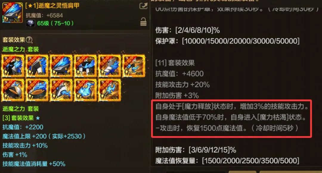 “逝魔套”這套裝備的特色在於,需要保證藍量在70%以上,才能觸發額外3%技攻,而捱打就會降低藍量!