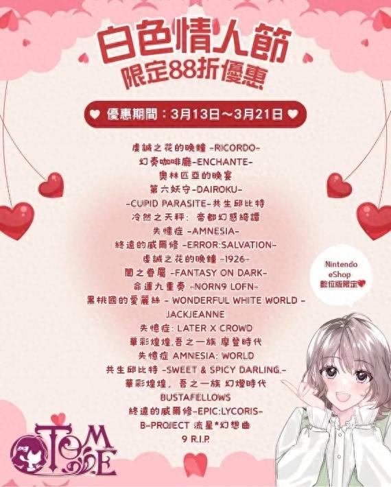 昨天,香港發行商GSE公佈了任天堂eShop白色情人節期間的促銷折扣。從3月13到3月21的一週時間內,玩家可以享受下圖在內,共計22部日本乙女遊戲的88折折扣。