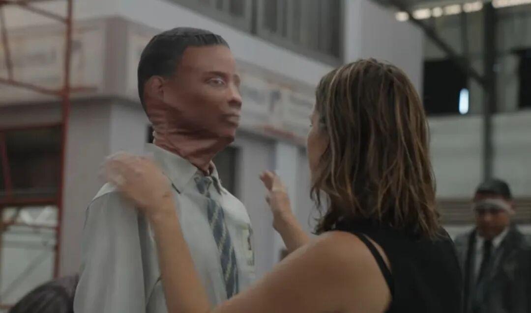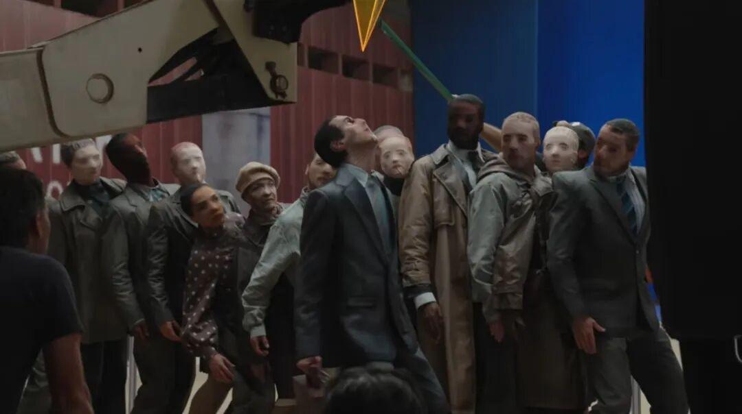 演員們穿着的戲服西裝上,低分辨率的布料紋理都是直接打印上去,以此製造視覺上的2D扁平感;演員的臉部和手部,也都穿上了印有多邊形紋理的面具和手套,力求製造出當年遊戲中經典的低多邊形(Low-poly)棱角感;就連羣演的僵硬無力的走路動作,也有專門的編舞團隊爲他們統一矯正成“NPC步伐”。