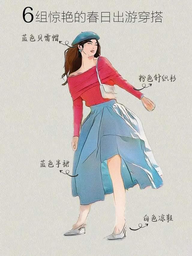 在配色上就佔上風,後續自然會更順利。粉色針織衫採用一字領設計,成功優化了肩部線條,裙子選擇不規則的剪裁,露出腿部線條更加苗條迷人。建議配雙白色低跟涼鞋,再戴頂藍色貝雷帽,輕盈又精緻。