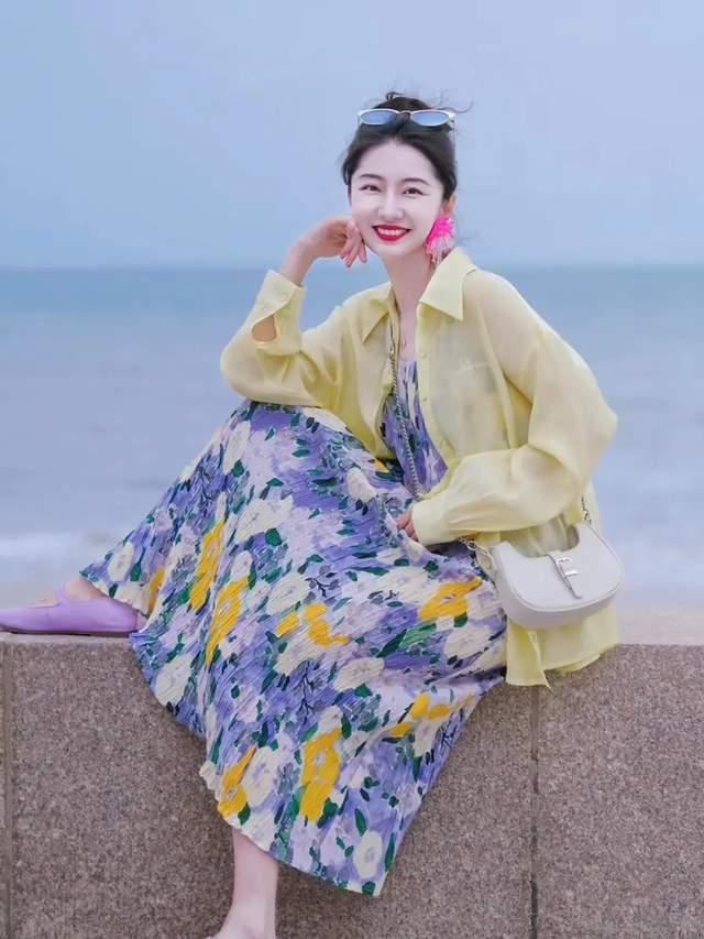 喜歡清新優雅風的姐妹,可以嘗試一下面料輕薄的黃色襯衫,也可以當成防曬衫穿,內搭紫色碎花連衣裙,簡直美的太耀眼了,爲了提升整體的精緻度,建議背款白色鏈條包,鞋子和裙子選同色系即可。