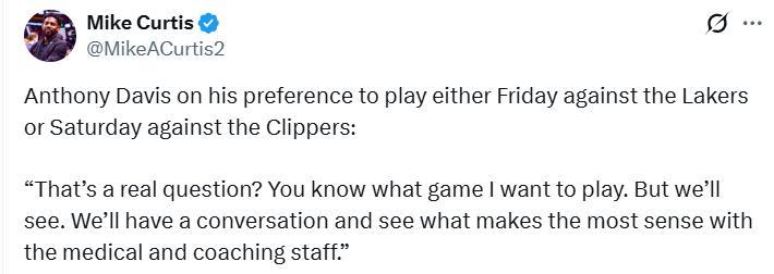 在連續休整兩晚後,獨行俠隊將前往洛杉磯開啓背靠背賽程,分別於北京時間週六對陣湖人、週日對陣快船。由於左小腿拉傷自10月30日起便缺席比賽,濃眉不會被允許連續出戰這兩場賽事。球隊計劃觀察他週五的身體狀態,再決定他將出戰週六還是週日的比賽。