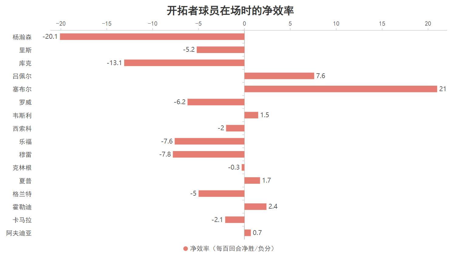 因此出場時間少不代表開拓者對他不夠重視也不代表隊友“霸凌”不給他傳球,至少在出場時他獲得了許多機會,出場時間低更多是由於他現在的缺陷導致他在場時會令球隊陷入被動。楊瀚森本賽季的淨效率爲負20.1,在開拓者全隊位於倒數第一,這意味着楊瀚森在場時開拓者每百回合會達到每百回合輸分最多的狀態,這也是教練只要想贏就不敢在常規時間更多使用他的原因。