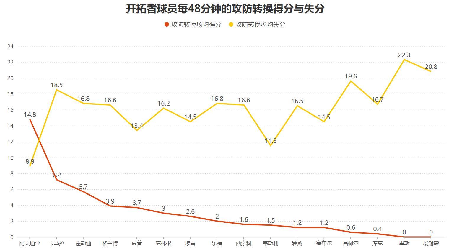 其二是楊瀚森的運動能力,這一點也是限制他最大的因素,楊瀚森目前爲止在攻防轉換方面的得分數爲零,這意味着他沒有任何反擊與快攻得分,反而當他在場時開拓者每48分鐘的攻防轉換失分達到了20.8分,這意味着楊瀚森的在場會令開拓者的陷入更慢的攻防狀態,而他在場時的攻防轉換失分也僅少於庫克,當然,庫克的總出場時間比楊瀚森還要少。