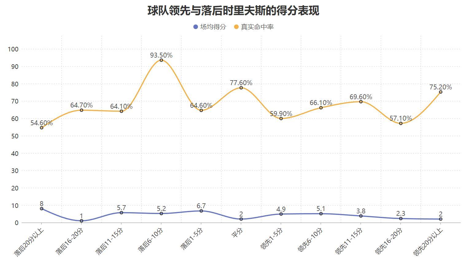 並且裏夫斯的得分不依靠球隊的局勢,當湖人與對手的分差較小時,他無論是場均得分還是結合三分罰球情況的真實命中率均能達到更高的水準,這意味着即使湖人在比賽中陷入落後的被動局面,裏夫斯還能打出更高水準的得分產量與效率,這一點也是其他普通球員不具備的能力,而裏夫斯不懼怕防守級別以及不會被球隊局勢影響到發揮的特點也令他成爲了湖人的關鍵人物: