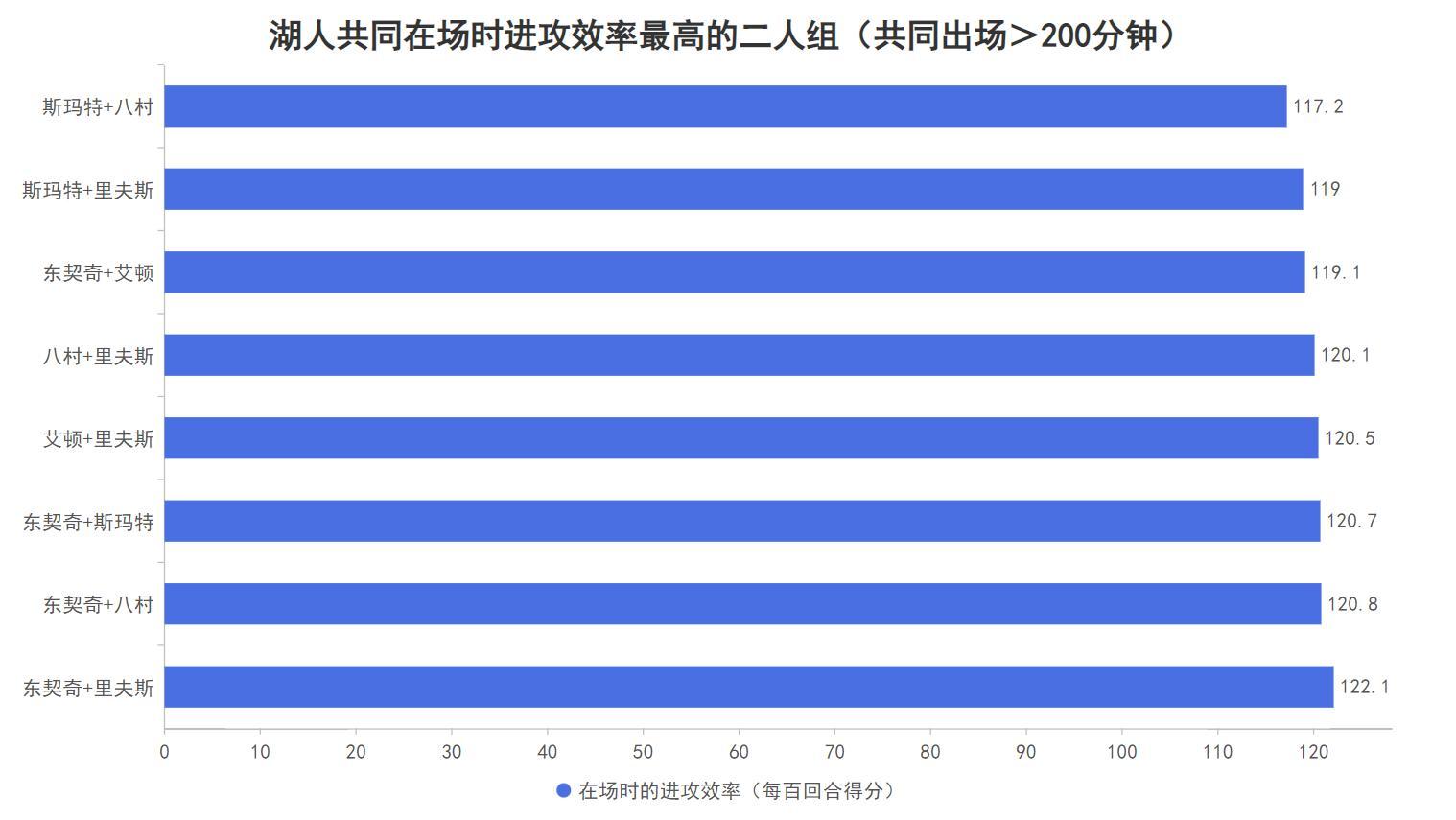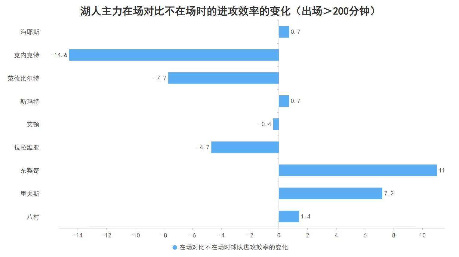 當裏夫斯在場對比不在場時,湖人的進攻效率從111.6提升到了118.8,這意味着裏夫斯在場能令湖人每百回合的得分數提升7.2分,這個在場時的正面作用位於湖人出場超過200分鐘以上的9名主力中的第二高僅次於東契奇;