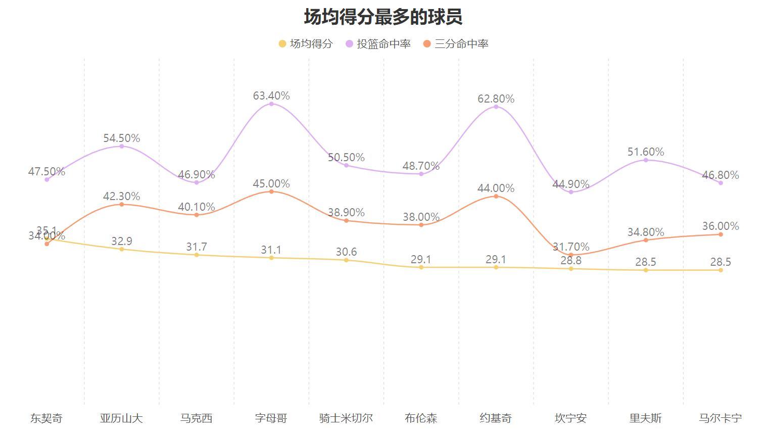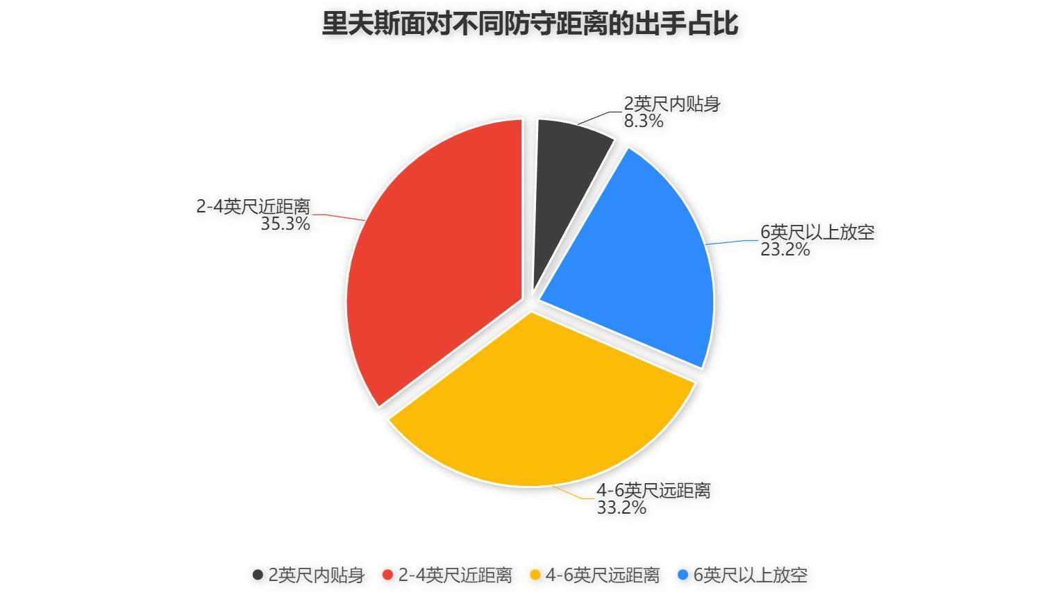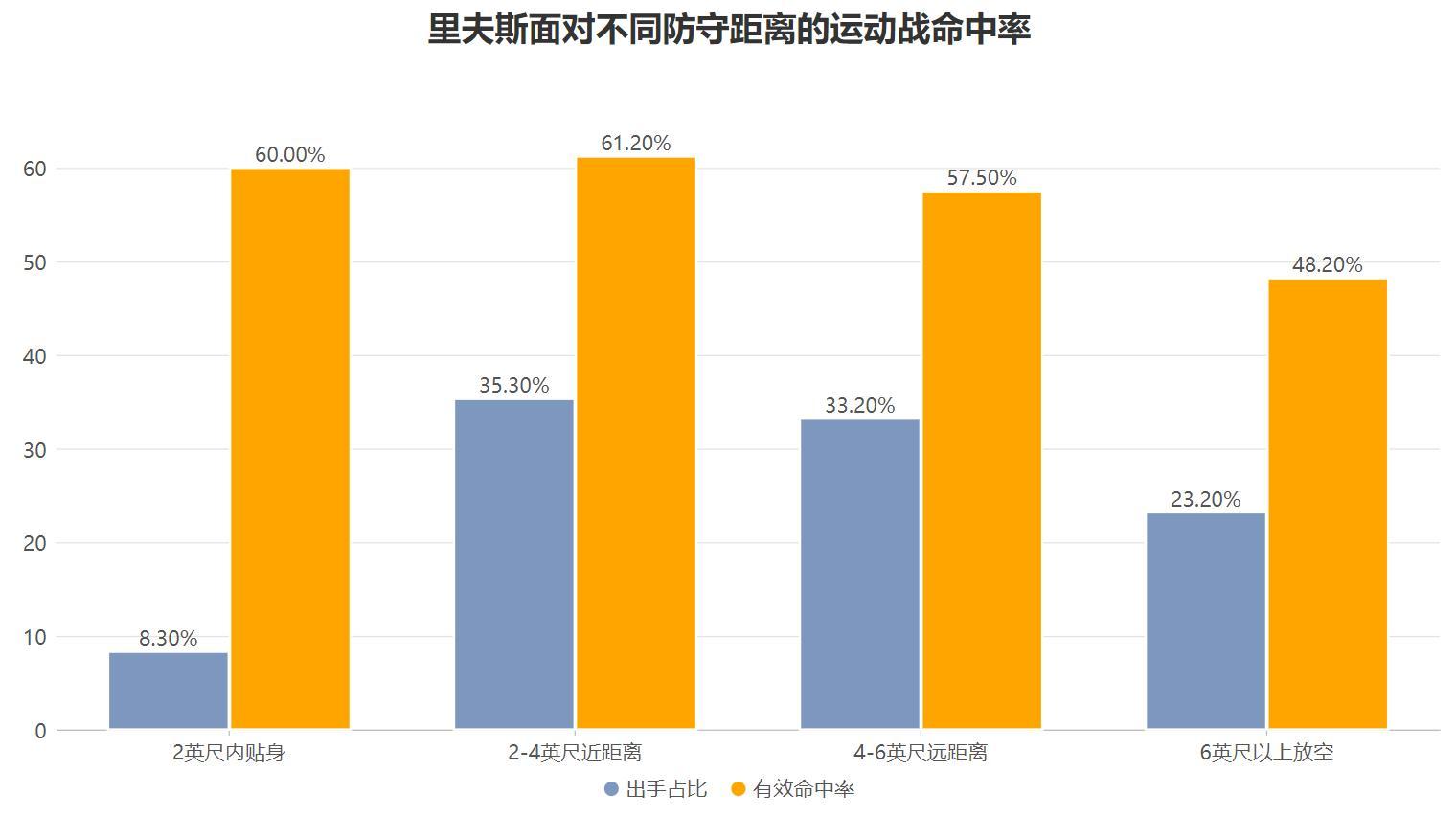 同時,無論他面對何種距離的防守他都能保證足夠的得分效率,在他面對2英尺內以及2-4英尺的嚴密防守時,他結合三分出手情況的運動戰也就是有效命中率分別達到了60%與61.2%,反而是他面對對手6英尺以上完全放空時有效命中率更低,這意味着即使面對着對手的嚴密防守時他的運動戰命中率依然是極高的存在,並且也可以表明能防住他的只有他自己手感不佳而與對手的防守沒有太大關係,他可以做到減少防守干擾完成高效得分。