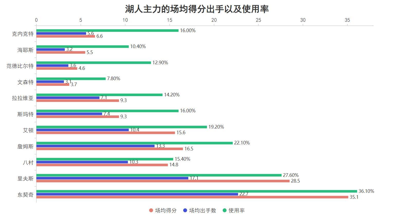 在湖人的主力球員中,裏夫斯的場均得分、出手數以及使用率均位於第二高僅次於東契奇,這意味着他獲得了全隊第二多的出手機會並且有着第二高的得分貢獻,從進攻體系來看他已經是穩穩的第二進攻核心了,而他本賽季的強勢不僅僅是基礎數據那樣簡單。