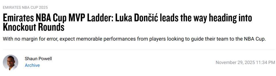 NBA盃賽MVP排名:東契奇領跑亞歷山大第二 裏夫斯第四詹姆斯未上榜