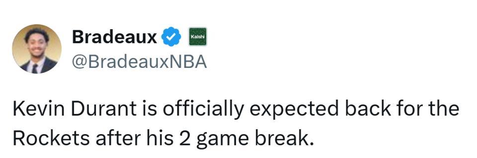 北京時間11月30日,火箭下一場比賽是明日(12月1日)凌晨4點對陣爵士,杜蘭特不在球隊的傷病名單上,預計將迎來複出。此前他因個人原因缺席了對太陽和勇士的比賽,火箭兩場比賽都獲得勝利。