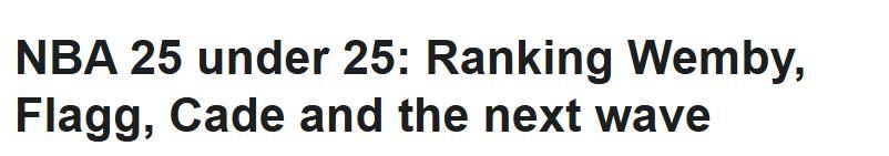 北京時間12月13日,ESPN評選了聯盟25歲以下的25大球星,評選標準是球員的長期潛力。馬刺的文班亞馬居首,森林狼的愛德華茲排名第2,活塞的坎寧安位列第3。火箭共計3人上榜,分別是排在第5的申京、排在第6的阿門以及排在第25的謝潑德。