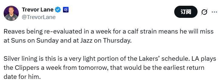 受NBA杯的影響,湖人未來一週只有兩場比賽,分別是12月15日客場對陣太陽以及12月19日客場對陣爵士。如果裏夫斯能在一週後迴歸,他預計會缺席這兩場比賽。他最快可以在下週對快船的比賽中復出。