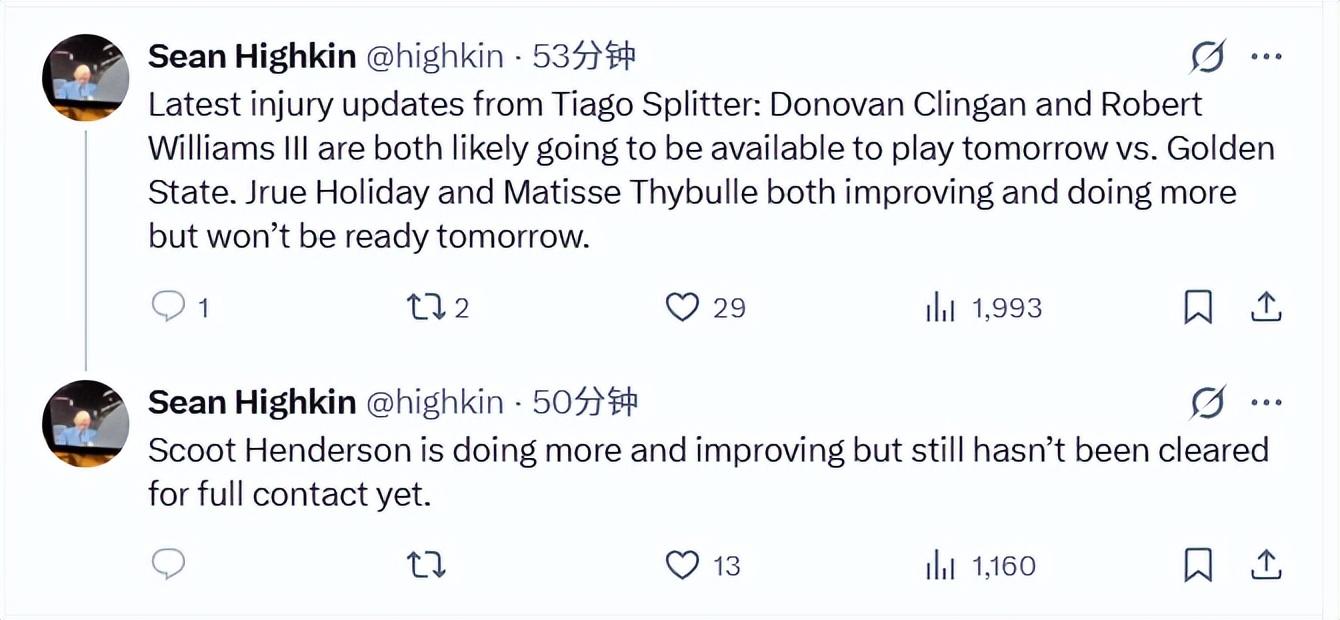 北京時間12月14日,據開拓者隊記Highkin報道,主帥斯普利特更新了球隊的傷情:克林根與羅威大概率可出戰明日對陣勇士隊的比賽。朱-霍勒迪、賽布爾的傷情均有所好轉,訓練參與度也逐步提升,但明日暫無法登場。亨德森的恢復情況正持續向好,訓練量也在增加,不過目前仍未獲準參與全對抗訓練。