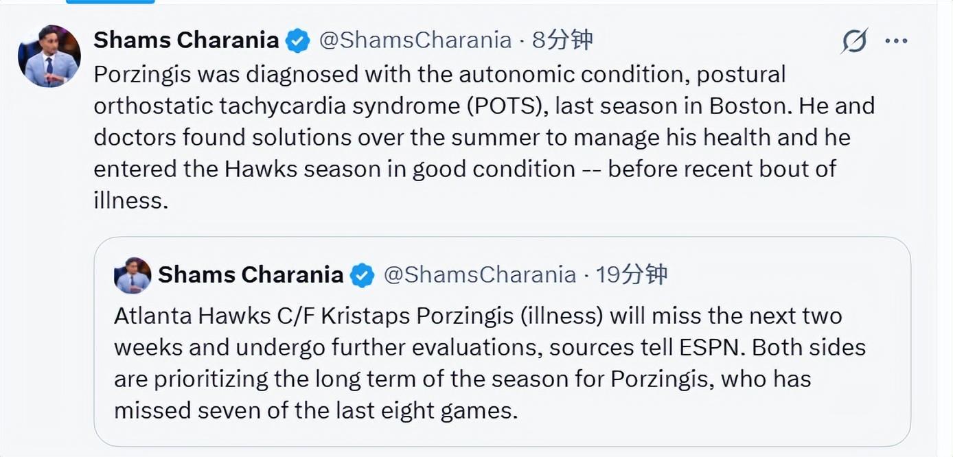上賽季效力凱爾特人期間,波爾津吉斯被確診患有自主神經功能障礙類疾病——體位性心動過速綜合徵(POTS)。休賽期,他與醫療團隊共同制定了健康管理方案,得以以良好狀態開啓老鷹隊的新賽季征程,直至近期突發疾病。