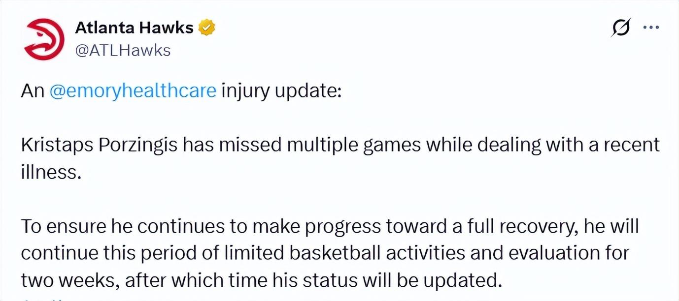 老鷹隊官方已通過一份新聞稿證實了該消息。據球隊方面透露,波爾津吉斯在未來兩週內將僅參與有限的籃球相關活動,屆時球隊會更新其傷病恢復進展。
