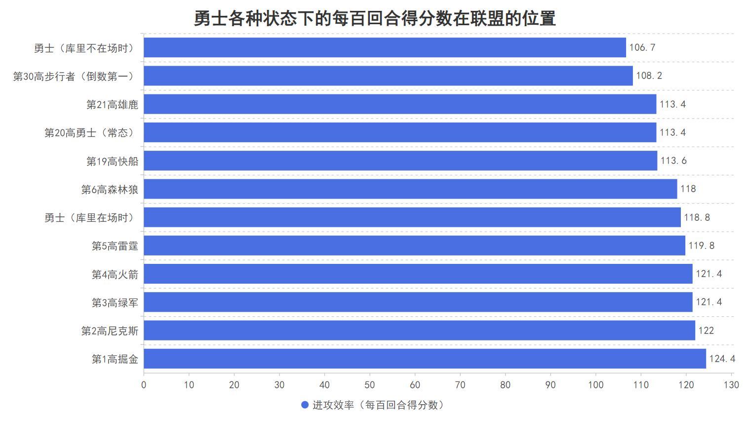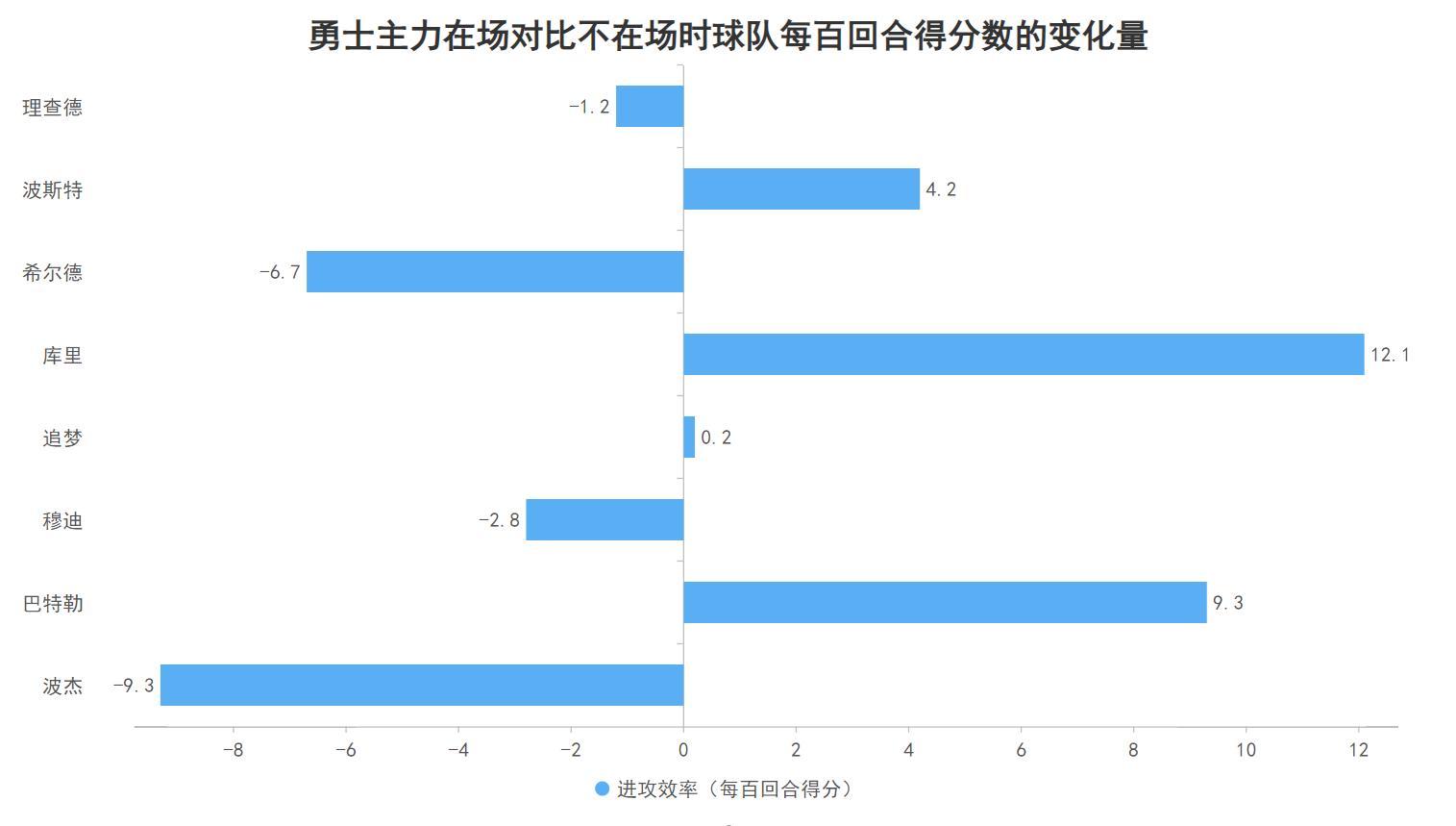 庫裏在場對比不在場時,勇士的進攻效率也就是每百回合得分數從106.7提升到了118.8,庫裏在場對比不在場時提升12.1的每百回合得分數爲勇士全隊最高;