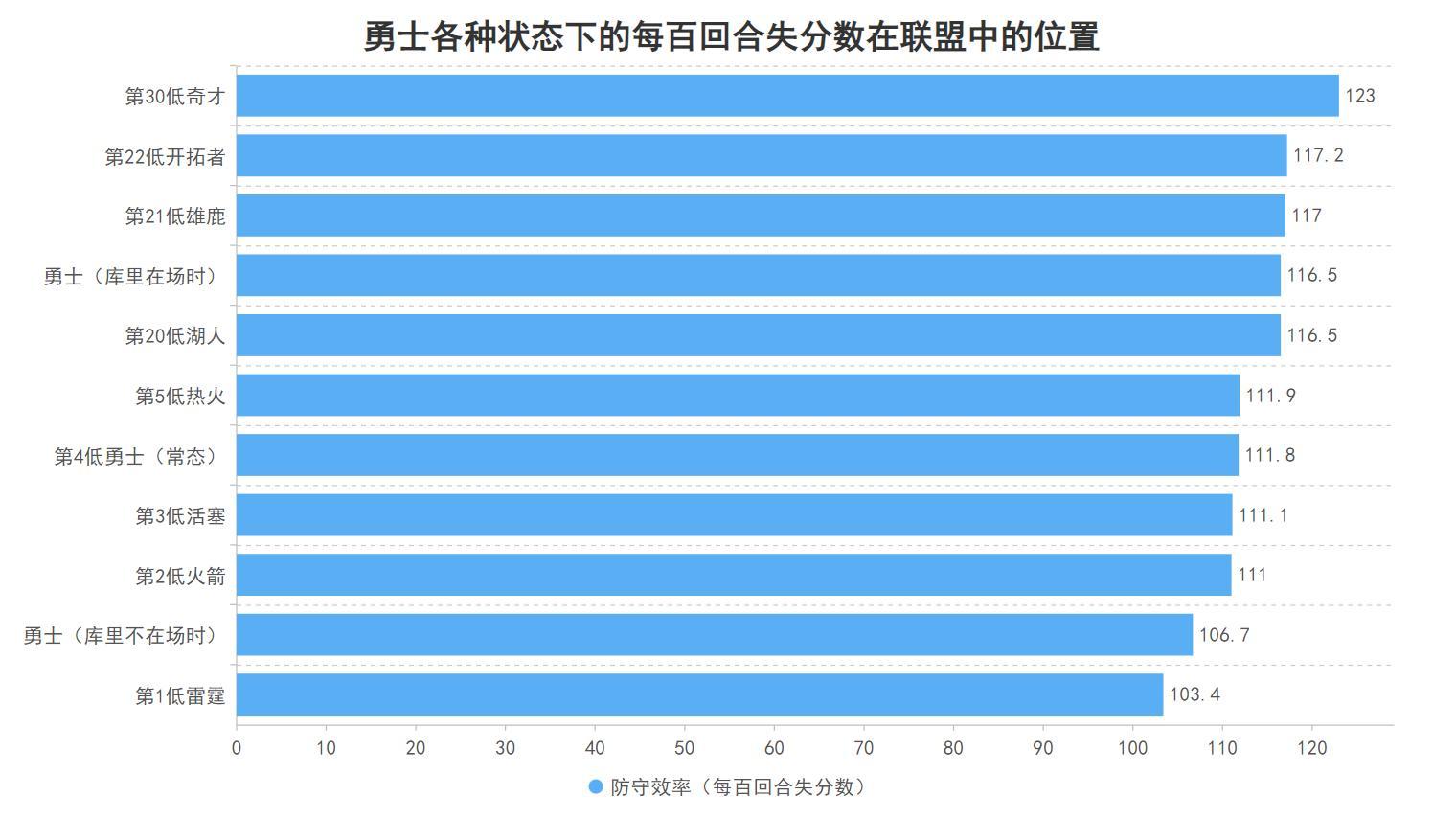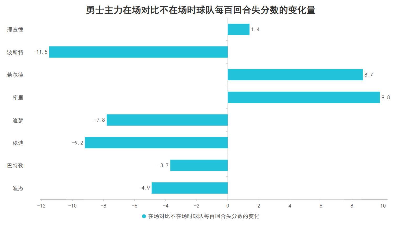 同時,當庫裏不在場時勇士的每百回合的失分數爲106.7,而當庫裏在場時勇士的每百回合失分數增加到了116.5,這意味着庫裏的在場令勇士每百回合的失分數增加了9.8分之多,這個在場對比不在場時令球隊失分數的增加幅度也位於勇士8名主力中的最高,這也意味着庫裏在場會令勇士的防守出現大幅度的下降。