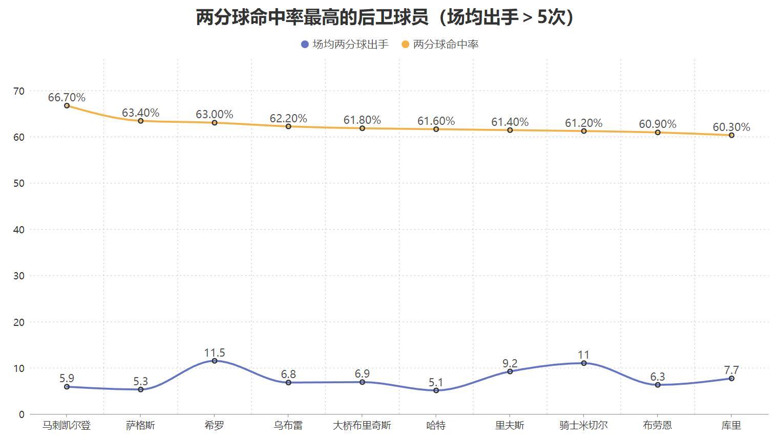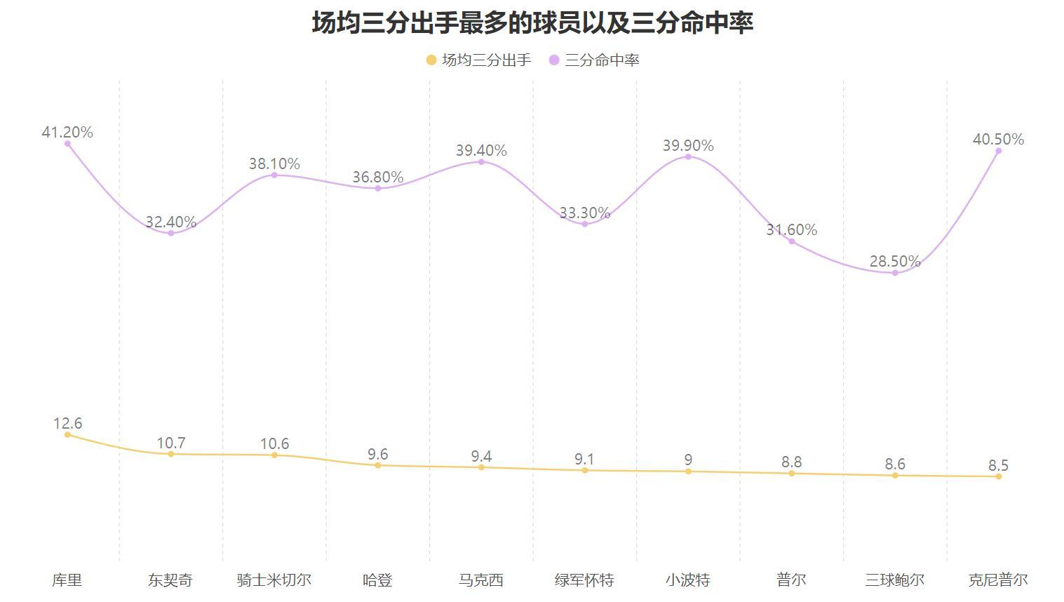 首先是依然誇張的三分能力,庫裏本賽季三分線外場均出手12.6次位於聯盟最多,而他41.2%的三分命中率也是場均三分出手最多的10人中的第一,這意味着無論是三分的產量還是效率他同時具備是聯盟最好的三分手;