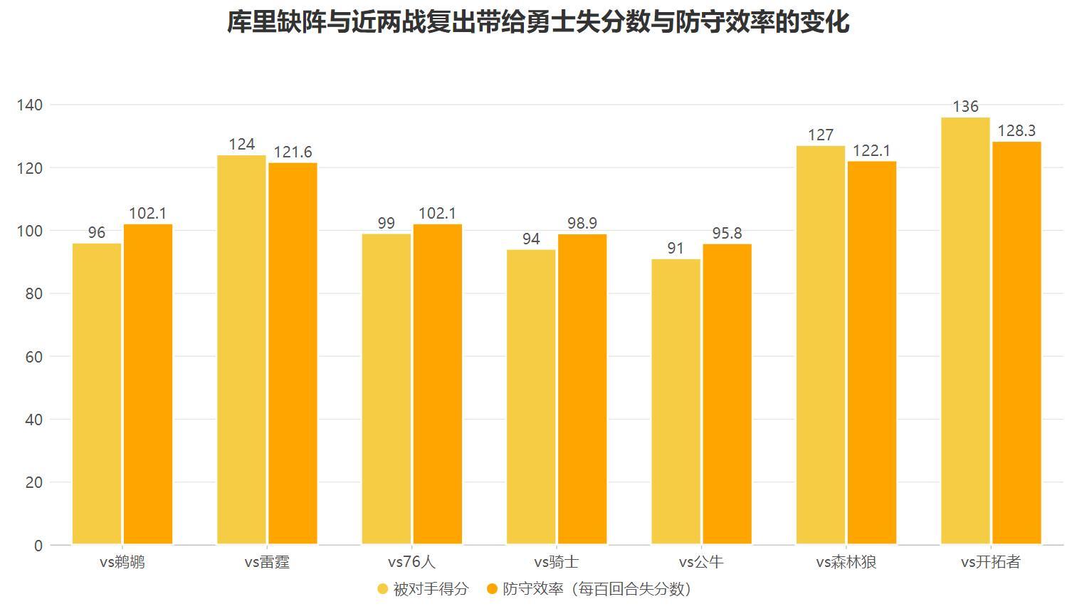 許多人認爲勇士近兩戰防守端完全崩盤是由於庫裏的復出,在庫裏受傷到復出前的五場比賽勇士互有勝負,但除了雷霆外其他球隊沒有在勇士面前轟下更多的分數,並且從防守效率也就是每百回合的失分數來看,除了面對雷霆外勇士的每百回合失分數也均在100左右,庫裏復出後的失分數與防守效率數值均達到了一個更高的情況,這些可以表明在庫裏復出後勇士的防守出現了下降。