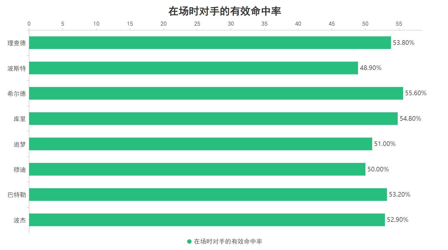除了失分數增加外,當庫裏在場時對手的運動戰也就是結合三分情況的有效命中率達到了54.8%,這個對手的有效命中率在勇士總出場時間最多的8名主力中位於第二高僅低於希爾德,這意味着當庫裏或希爾德在場時對手會達到運動戰命中率最高的狀態;