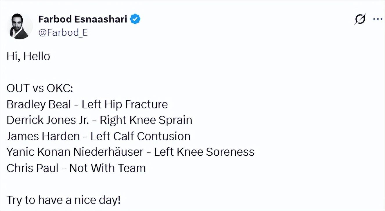北京時間12月18日,快船官方更新明日對陣雷霆的傷病名單,哈登確定因左小腿挫傷缺陣。此外,比爾、小德里克-瓊斯、尼德豪澤、保羅也都在缺陣名單上。隊記報道,哈登沒有隨隊前往俄克拉荷馬城,後續對陣湖人的比賽狀態暫不確定,他也有可能缺席洛城德比。