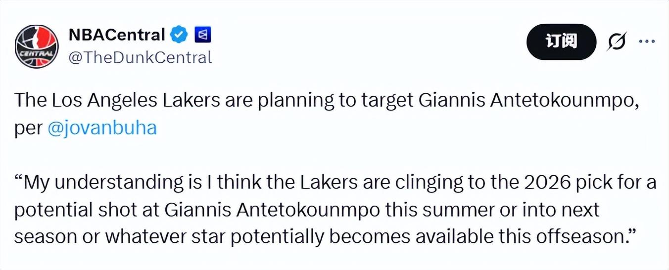 北京時間12月18日,據湖人隊記布哈透露,湖人隊一直牢牢攥着2026年的首輪選秀權,意在今年夏天或下個賽季抓住機會引進字母哥。