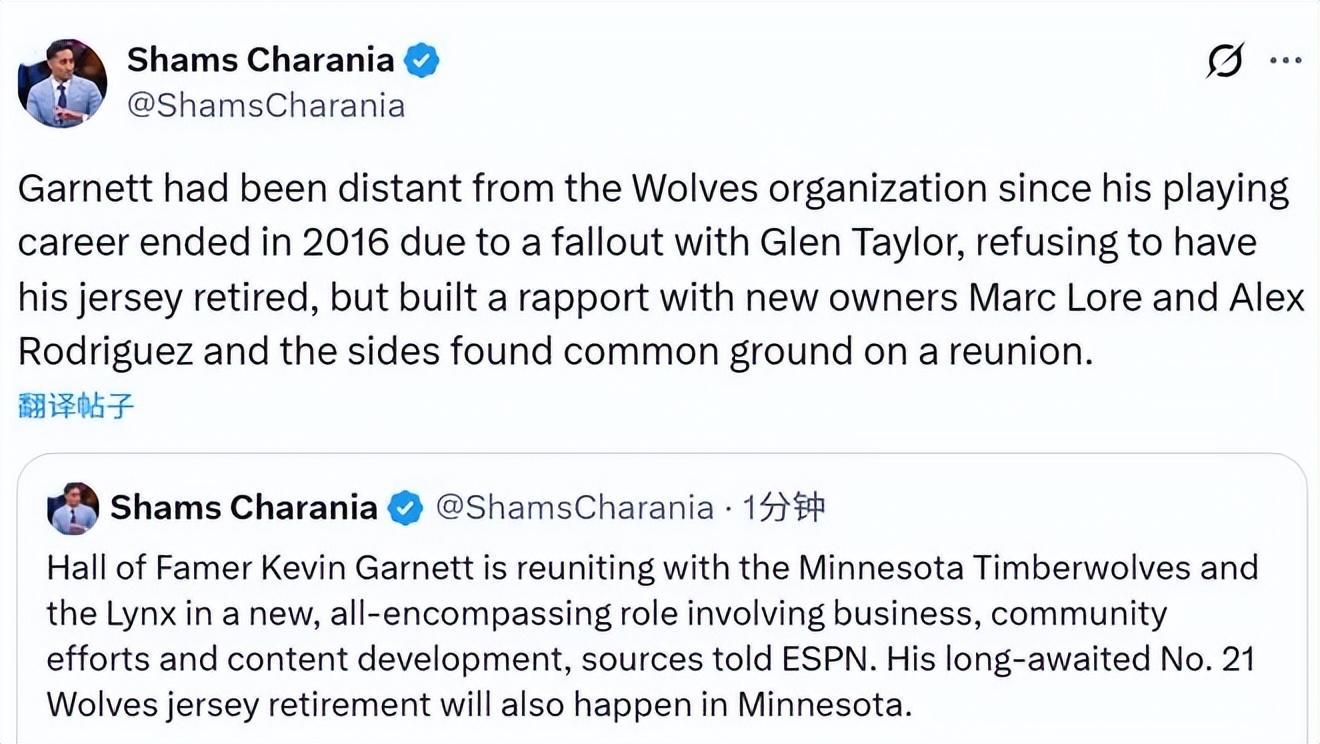 狼王迴歸!加內特重返森林狼任職 21號球衣退役將在明尼蘇達舉辦