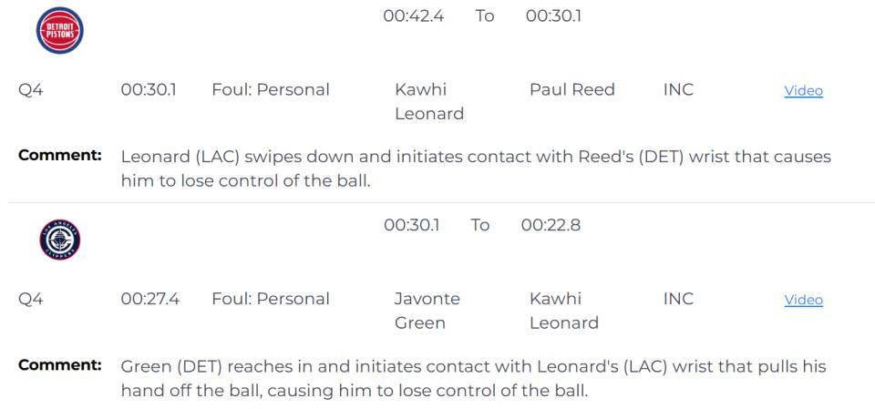 第二次漏判,出現在距離比賽結束還有27.4秒,也就是萊昂納德搶斷完成後不久,活塞隊的格林伸手切球,也碰到萊昂納德的手腕,將他的手從球上撥開,致使萊昂納德丟球。這同樣是一次漏吹的防守犯規,不過,這一球最終出界,球權還在快船手中。