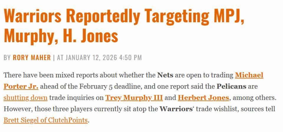 北京時間1月13日,據名記西格爾報道,儘管關於籃網是否願意在交易截止日前送走小邁克爾-波特的報道衆說紛紜,且有消息稱鵜鶘已叫停特雷-墨菲和赫伯特-瓊斯等人的交易詢價,但這三位球員目前仍高居勇士隊的交易願望清單榜首。
