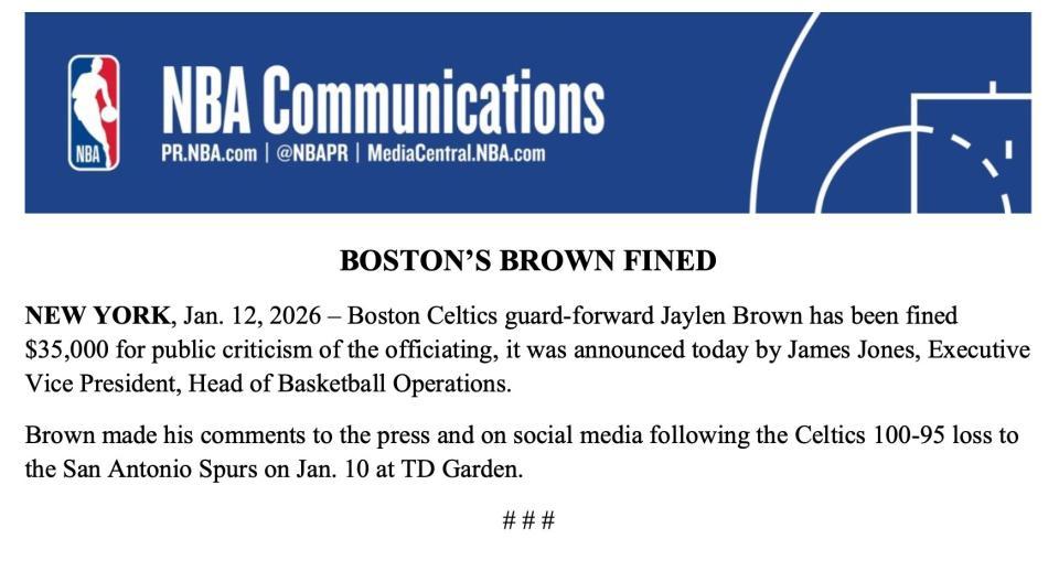 北京時間1月13日,NBA官方宣佈,波士頓凱爾特人球員杰倫-布朗因公開批評裁判,被處以35000美元罰款。布朗是在1月11日凱爾特人於TD花園球館以95-100不敵馬刺的賽後,向媒體及社交媒體發表了相關言論。
