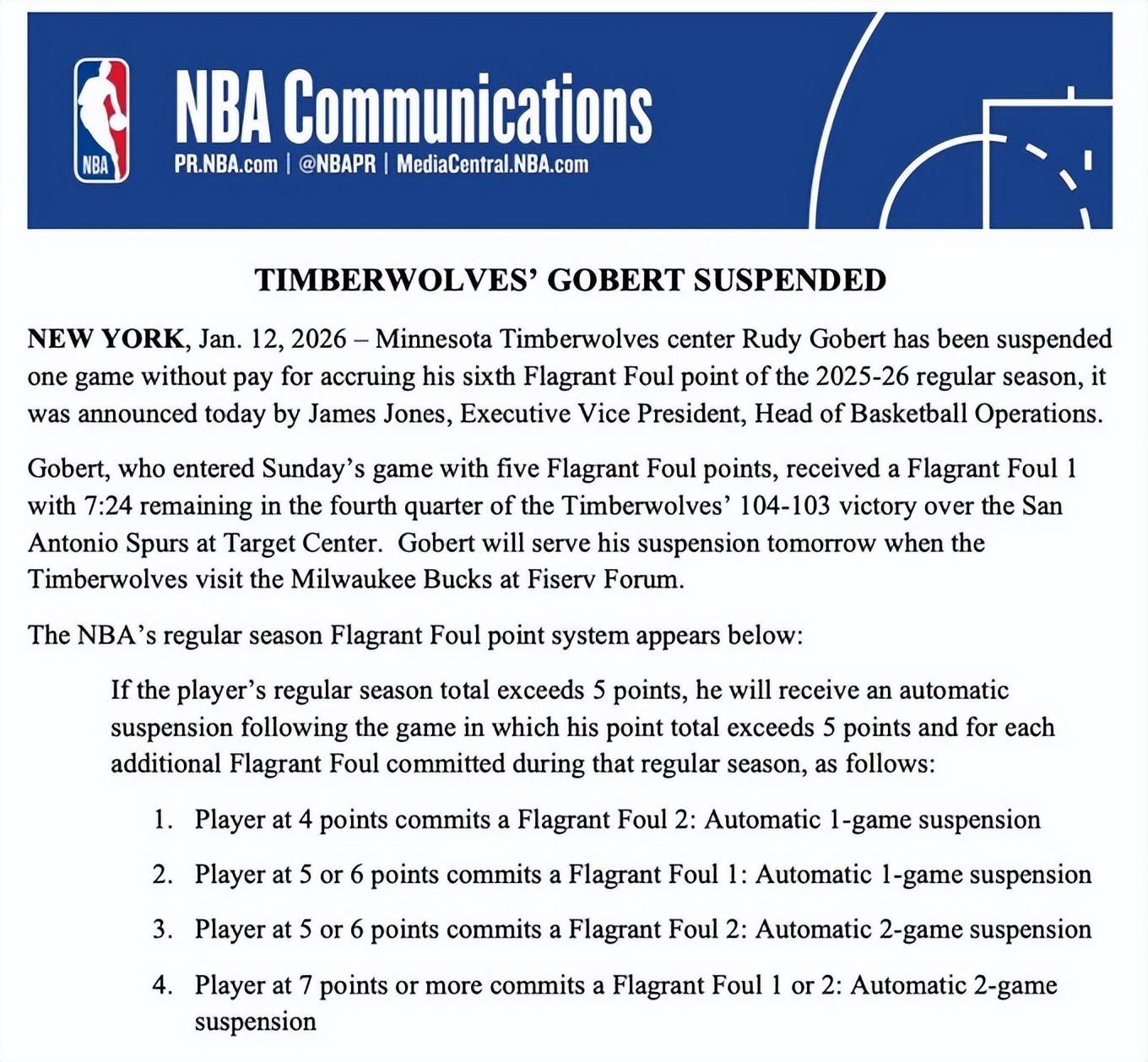 北京時間1月13日,NBA官方宣佈,明尼蘇達森林狼隊中鋒戈貝爾因在2025-26賽季常規賽中惡意犯規積分累計達到6分,將被無薪禁賽一場。此次禁賽將讓戈貝爾損失201149美元的薪水。森林狼隊也將因此獲得100575美元的奢侈稅差額抵免。