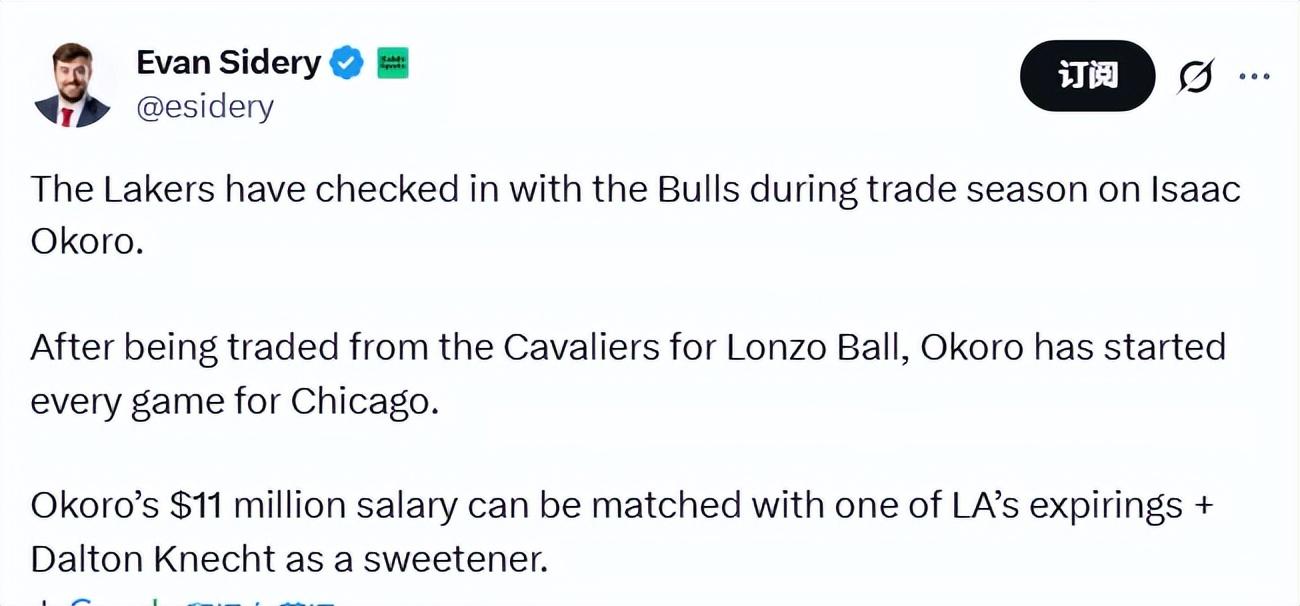 Sidery表示,奧科羅本賽季的薪資爲1100萬美元,下賽季是1181萬美元。湖人可通過一份到期合同+克內克特的組合匹配薪資,完成這筆潛在交易。