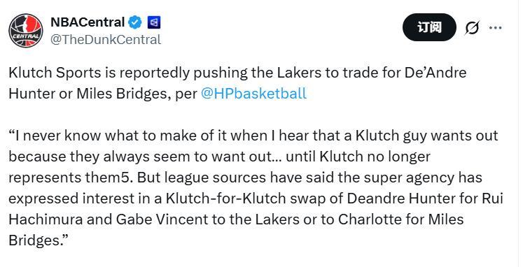 Hardwood Paroxysm寫道:“每次聽到Klutch旗下的球員想要離隊,我都不知道該作何感想——他們似乎總嚷嚷着要走……可直到Klutch不再代理他們的合約,這種聲音就消失了。不過據聯盟消息源透露,這家頂級經紀公司已表達了交易意向,希望促成一筆‘Klutch內部球員互換’:要麼將德安德烈-亨特送至湖人,換取八村塁和加布-文森特;要麼用同樣的籌碼,向夏洛特黃蜂隊交易邁爾斯-布里奇斯。”