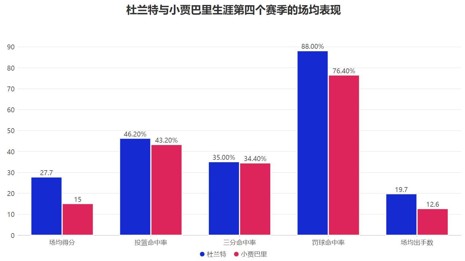 小賈從身體硬件與天賦來看可謂是小號版本的杜蘭特,他具有2.11米的身高卻是能內能外的得分手,一手面對防守的強投也神似杜蘭特,但已經來到第四個賽季的小賈對比同期的杜蘭特可謂是天差地別:杜蘭特的第四個賽季已經是蟬聯得分王並且帶隊殺入西決了,而小賈無論是數據還是成績都顯然是相差甚遠,但小賈對於目前的火箭隊而言卻有難以被取代的作用。
