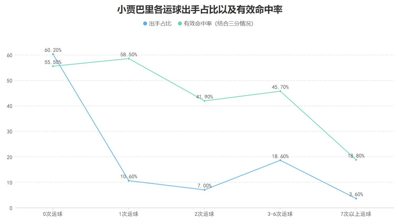 小賈本賽季接球不運球的出手佔比高達60.2%,運球兩次以內的出手佔比也有17.6%,同時小賈不運球與1次運球出手的運動戰,也就是結合三分情況的有效命中率可以達到更高水準,因此小賈最適合接球后短暫調整的直接出手,這樣是他最喜歡也是最擅長的得分方式,雖然有明顯的缺陷但對於火箭而言正需要他的這種接球出手的能力:
