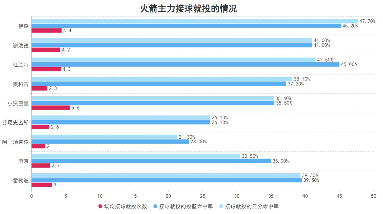 小賈本賽季場均有5.6次全隊最多的接球就投,雖然接球就投的投籃命中率以及三分命中率都不算高但結合出手數已經是火箭隊內相對高效的球員了,因此當小賈在場時火箭屬於既有人提供突破與分球,也有人提供外線火力支持,因此小賈的發揮非常關鍵,伊森原本也可以完美髮揮這樣的作用但烏度卡卻時常不給他出場機會並且還有傷病的問題。