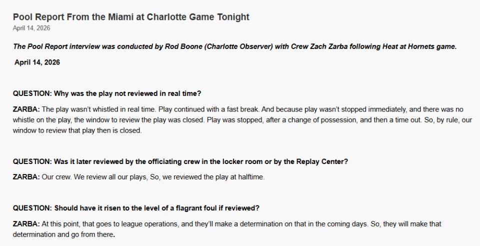 北京時間4月15日,黃蜂記者羅德-布恩在熱火對陣黃蜂賽後對裁判組負責人扎爾巴進行採訪,詢問比賽中相關的爭議回合。這個回合出現在第二節,當時拉梅洛-鮑爾(三球)拉到阿德巴約的腳踝,造成阿德巴約腰部受傷離場。裁判當時沒有任何判罰,也沒有回看。扎爾巴回應了相關的話題——