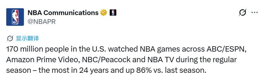 創24年新高!NBA常規賽全美收視人數1.7億:較上賽季大幅上漲86%