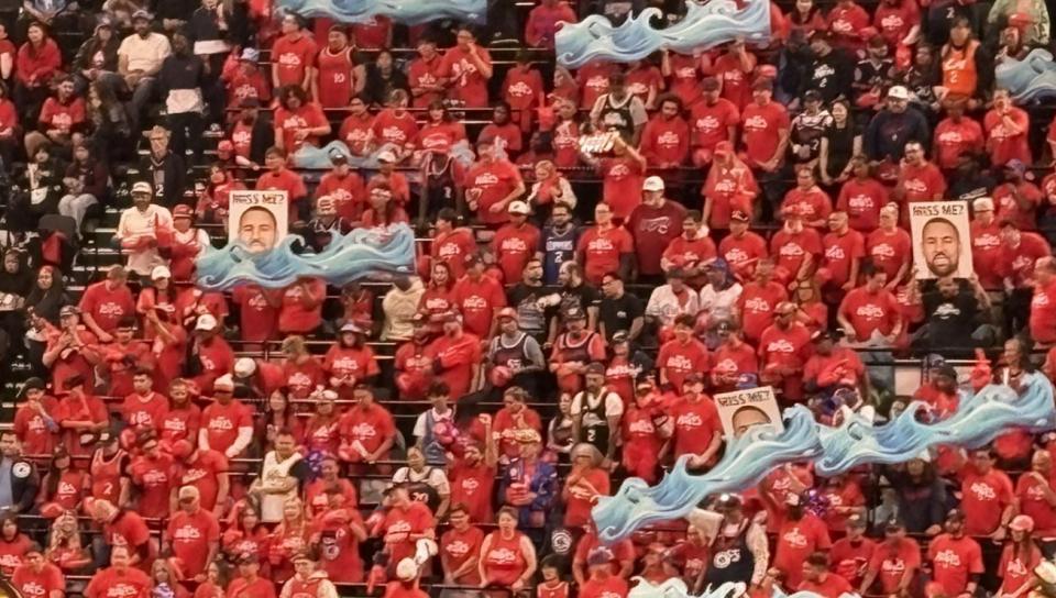 快船球迷試圖干擾勇士球員罰球,舉着克萊的頭像,上面寫着“想我了嗎?”