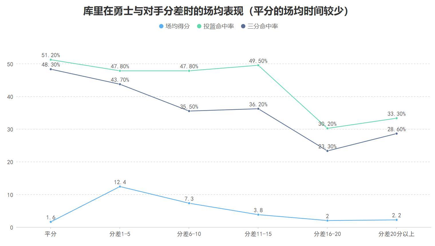 庫裏本賽季在勇士與對手分差在5分之內時有着更高的得分產量以及兩項命中率,這意味着當分差接近時他有更多的得分也更加高效,但分差較大時他顯得較爲隨意因而低效,而勇士的進攻上下限也都是庫裏決定的: