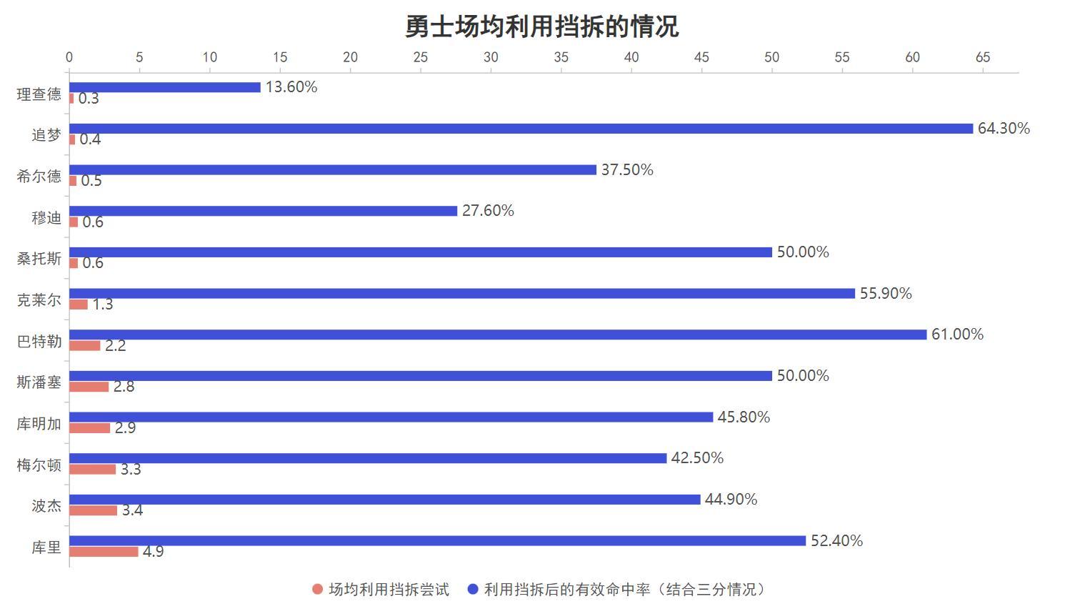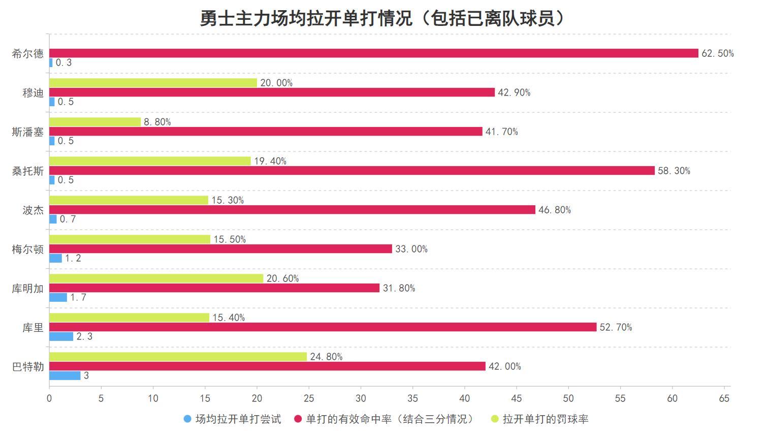 勇士陣容完整時解決此問題靠的是拉開單打與利用擋拆發起進攻,本賽季巴特勒與庫裏有着勇士隊內最高的拉開單打嘗試,庫裏有着更高的拉開單打運動戰,也就是結合三分情況的有效命中率,巴特勒雖然有效命中率稍低但有着24.8%的製造犯規佔比,當勇士傳切失效時他們更多依賴這兩人的單打,而由於傷病導致勇士的單打幾乎喪失殆盡。