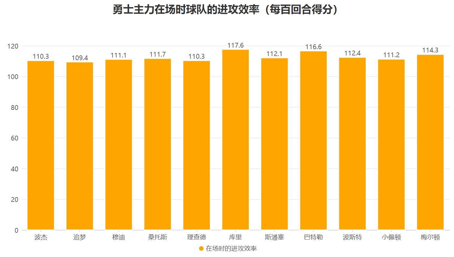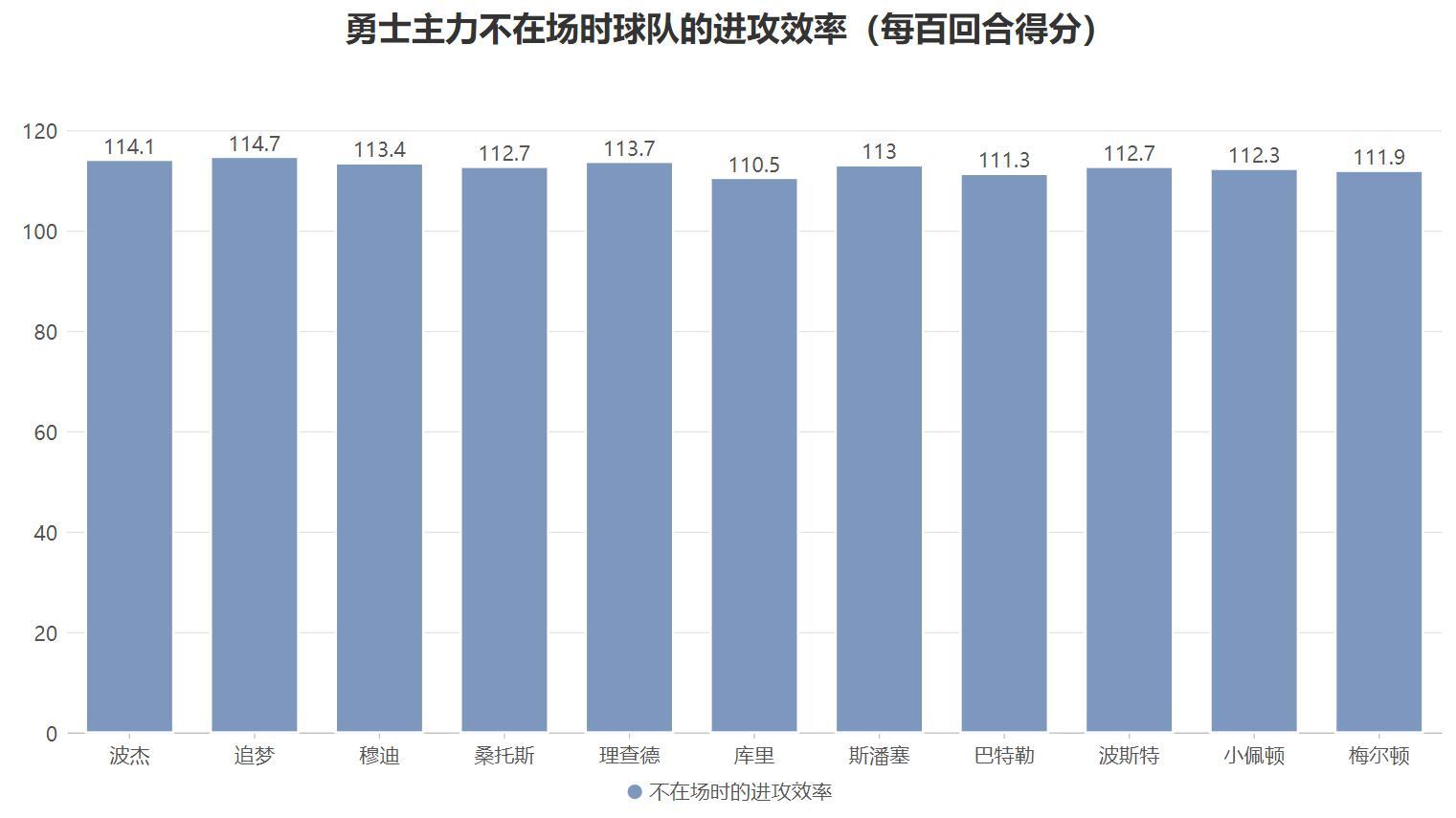 當庫裏不在場時,勇士的進攻效率爲110.5,這意味着當庫裏不在場時勇士每百回合的得分數僅有110.5分,這個進攻效率數值爲勇士出場超過1000分鐘的11名主力中的最低;