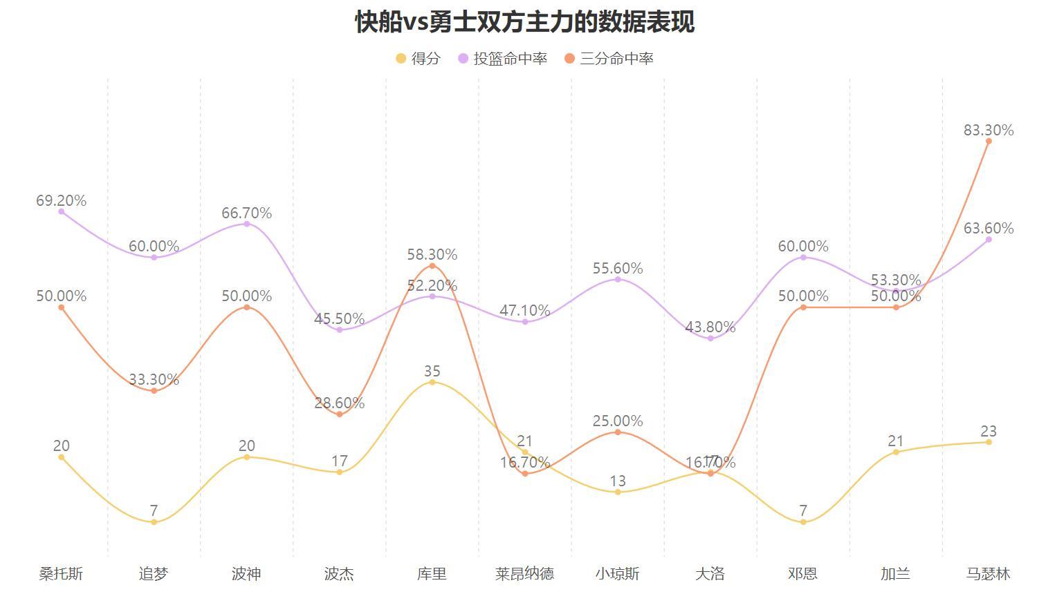 此戰的庫裏身體狀態並不算很好,比賽中他兩次離場返回更衣室但都再次迴歸,而庫裏的12次進球+7記三分球拿到的35分也是兩隊的最高分,在勇士一度落後兩位數的情況下庫裏下半場轟下了27分還命中了關鍵三分可謂是真正的燃盡了。